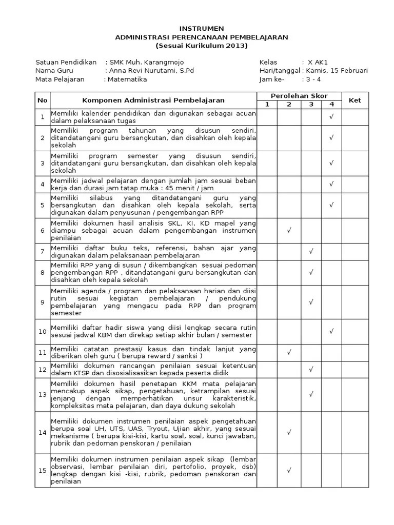 Contoh instrumen supervisi administrasi guru. Supervisi dilaksanakan oleh pengawas binaan kepada guru mata pelajaran, beberapa guru lainnya, dan kepala sekolah. Tujuannya adalah membantu kepala sekolah untuk menyupervisi guru mata pelajaran sejenis karena jumlah guru yang sangat banyak, diambil guru . Media berbagi pengetahuan, pengalaman, informasi terkait penerapan kurikulum 2013, file aplikasi yang berguna bagi pendidikan. Sistematika laporan pelaksanaan supervisi akademik .